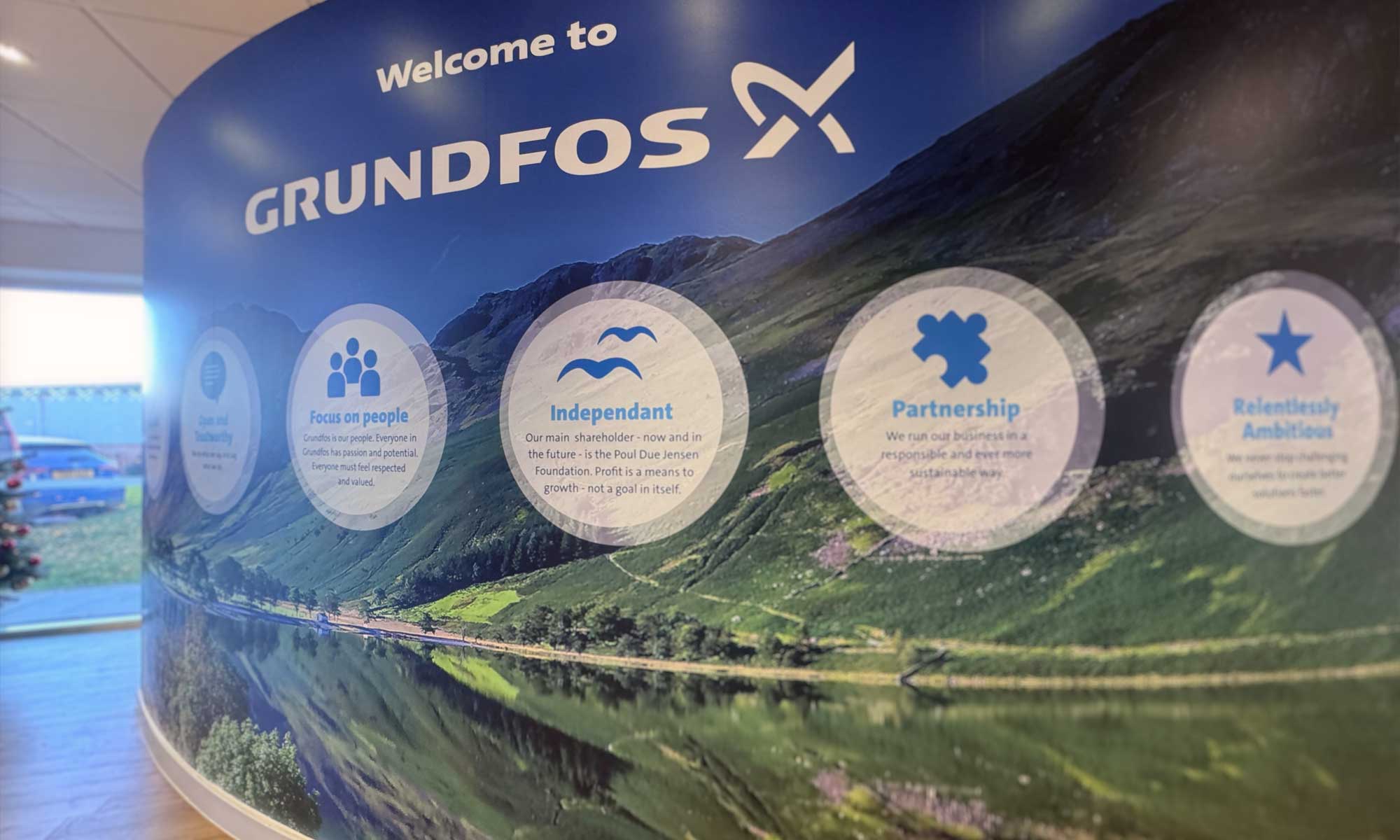 Working closely with the Grundfos team, we developed bespoke wall graphic concepts that combined striking landscape imagery with clear, accessible messaging. The designs reflect Grundfos’ commitment to sustainability and their connection to the natural world, while carefully considered layouts, typography, and brand colours ensure the values are easy to understand and visually engaging. Particular attention was given to how the graphics would flow across curved reception walls, ensuring a seamless and high-quality finish.